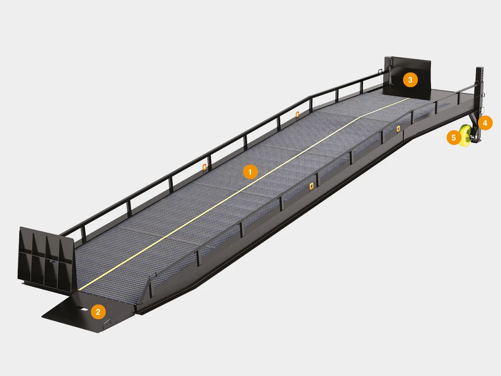 Такая мобильная рампа для эстакады имеет небольшие габариты, что позволяет использовать конструкцию в условиях ограниченного пространства склада или базы. Оснащается электрогидравлическим приводом средней мощности.